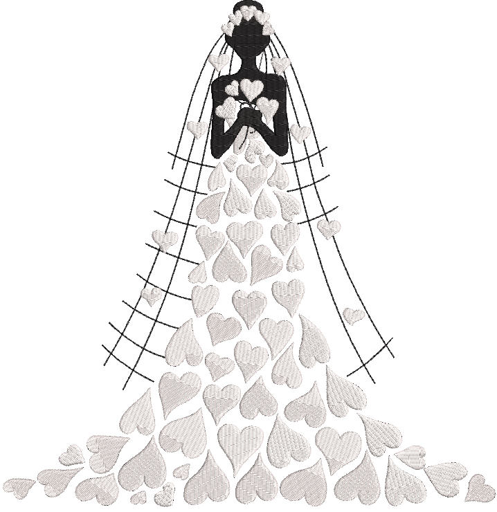 Bride Dress of Hearts embroidery design features a graceful bride in a gown made of flowing embroidered hearts. Perfect for wedding gifts, bridal accessories, keepsakes, and home décor. This elegant design brings romance and sophistication to your embroidery projects, making it a beautiful choice for special occasions.