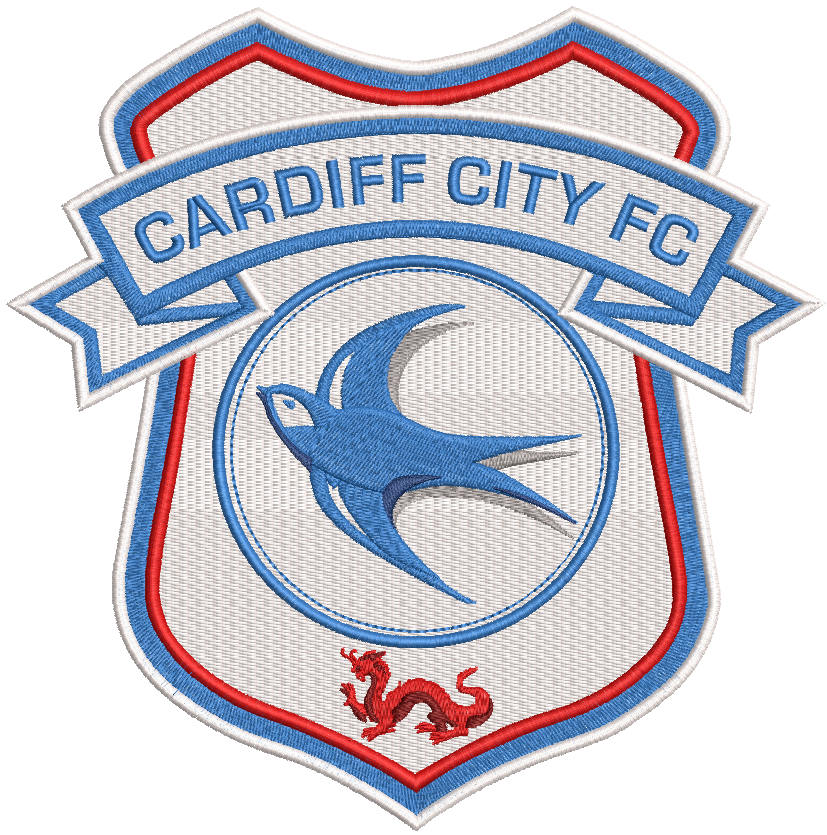 Cardiff City Football Club logo embroidery design. High-quality digitized machine embroidery file featuring the iconic Bluebirds crest. The design showcases the dominant bluebird positioned front and center on a traditional shield, with a smaller red Welsh dragon below in tribute to the club's heritage[reference:0][reference:1]. Perfect for customizing T-shirts, hoodies, caps, scarves, and fan gear. Formats: PES, DST, EXP, VP3, HUS, JEF. Compatible with all major embroidery machines. Instant download.