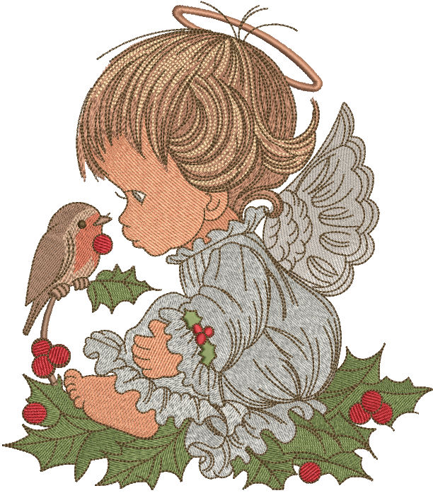 Add magic to your holiday stitching with this Christmas angel with bird embroidery design. Featuring a gentle angel in a delicate gown, sitting on holly leaves and sharing a berry with a robin, this festive motif is ideal for stockings, pillows, wall hangings, or baby’s first Christmas keepsakes. Digitized for high-quality results on any embroidery machine.