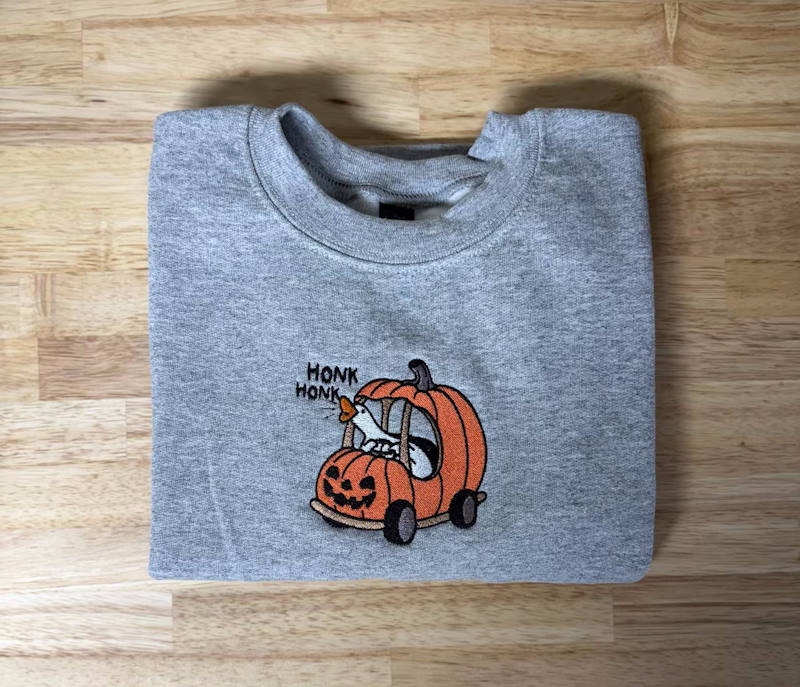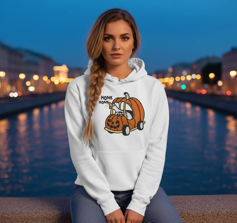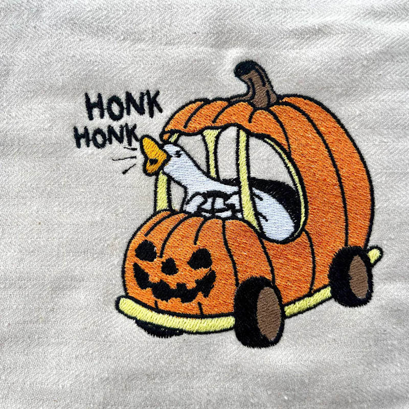 This adorable design features a goose honking happily from inside a pumpkin-shaped car, complete with a Jack-O’-Lantern face and festive orange details.