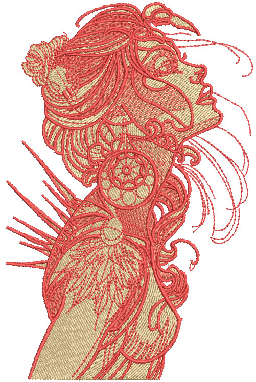 Embrace mysticism and tribal elegance with this Dream Time embroidery design, featuring a powerful Native-inspired woman, dreamcatcher, and flowing hair. Perfect for jackets, bags, decor, or artistic embroidery pieces.