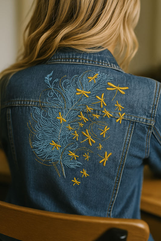 Bring elegance to your projects with the Feather and Gold Dragonflies embroidery design. This delicate pattern combines a detailed feather with golden dragonflies in flight, perfect for clothing, cushions, tote bags, and decorative textiles. High-quality, easy-to-stitch machine embroidery file that adds a touch of fantasy and natural charm to handmade creations.