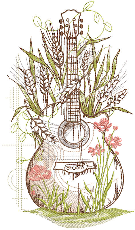 This Flower Guitar embroidery design blends music and nature with graceful sketch lines, blooming flowers, wheat stems, and soft shading. Perfect for boho apparel, tote bags, denim jackets, pillow décor, and creative gifts. Lightweight stitching makes it suitable for quilts, linen, and decorative textile projects.