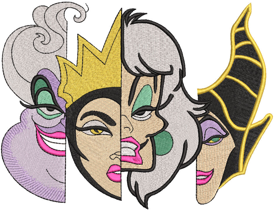 Celebrate your favorite villains with the Four Villains embroidery design featuring Maleficent, Ursula, Cruella, and more! Perfect for jackets, Halloween bags, and bold fan gear.