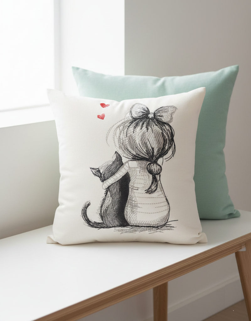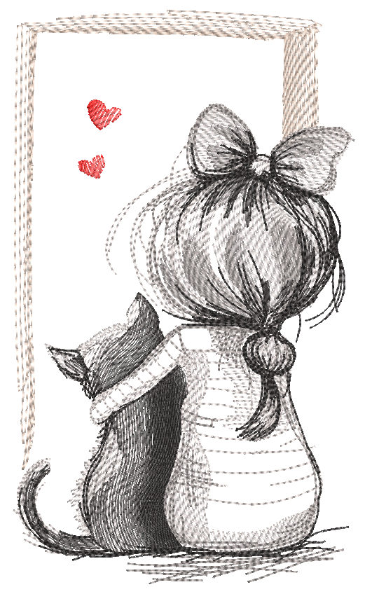 The Cat and Girl sketch free embroidery design is a touching illustration of quiet friendship and warmth. Soft pencil-style stitches, delicate outlines, and tiny heart accents create a calm, emotional scene. The minimal sketch look makes this design feel light, modern, and timeless.