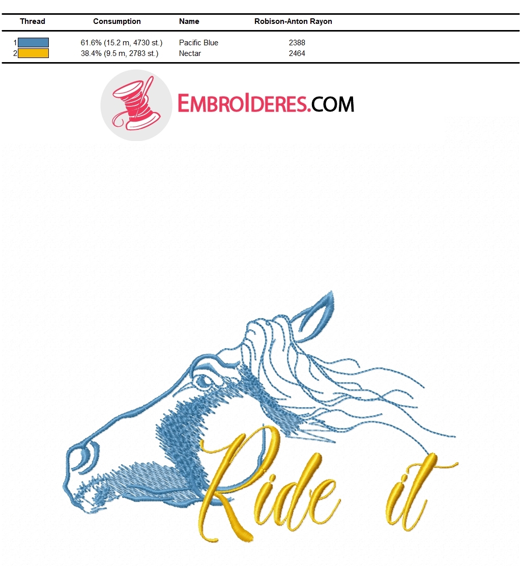 We make a gift for a horse-riding fan and horses? Here is a good and the most important is the free choice-the Ride it free machine embroidery design. The design is not tight and it's good for decorating a summer T-shirt. You can use it as a logo of a horse club or sports organization. Colors can be matched to the color of the product. Compatible with any embroidery machine. A single layer of stabilizer with a density of 40-60 grams per m2 is sufficient.
