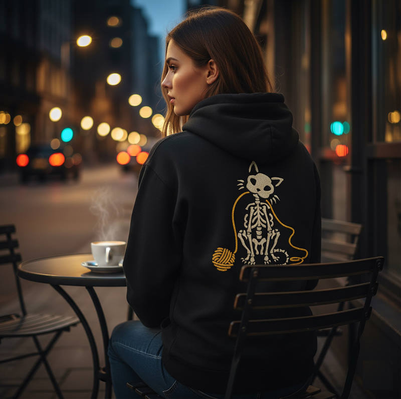 This quirky design features a skeletal cat holding a golden yarn ball, blending creepy Halloween style with adorable feline charm. Whether you’re decorating your outfit or making themed gifts, this pattern is sure to turn heads.