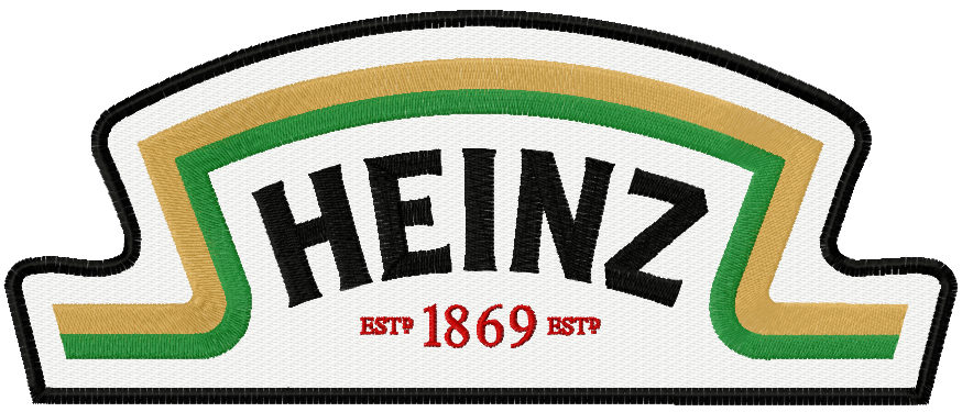 This <strong">Heinz Big Logo Embroidery Design features a large, arch-shaped emblem with strong black lettering, vintage red date accents, and smooth gold-and-green decorative borders. The clean curves and bold typography create a timeless, recognizable food-label aesthetic perfect for kitchen décor, aprons, chef jackets, reusable grocery bags, retro café textiles, and novelty patches.