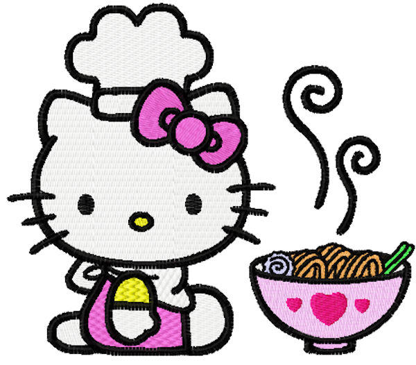 Adorable Hello Kitty embroidery design featuring her as a chef with a hot bowl of noodles. Perfect for aprons, kitchen towels, kids’ clothes, and foodie gifts!