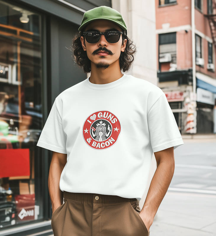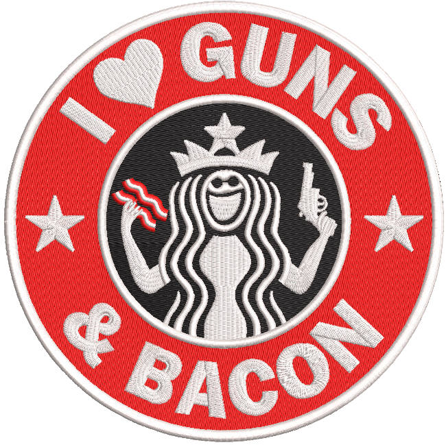 Bold and funny “I Love Guns & Bacon” embroidery design. Ideal for patches, jackets, tactical gear, BBQ aprons, or humorous gifts. A bold statement for bacon and gun lovers!