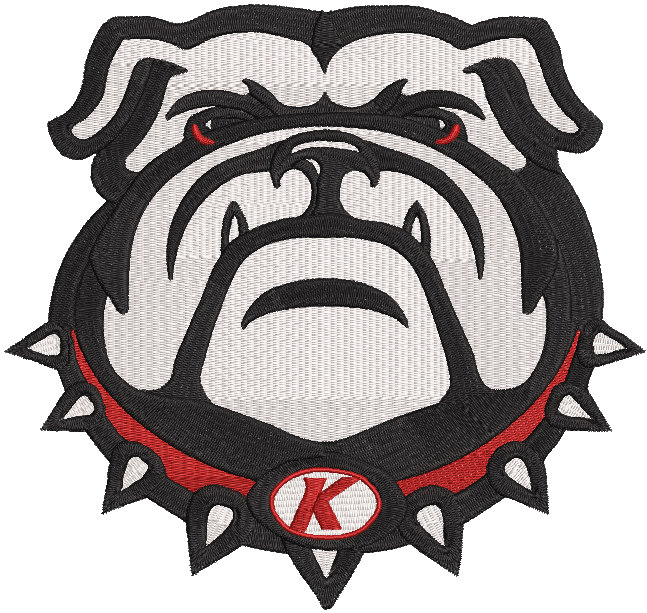 This Kimberly School Bulldog Logo Embroidery Design features a fierce, determined bulldog mascot with bold outlines, sharp facial details, and a classic spiked collar with a prominent “K” medallion. The contrasting shades of black, grey, white, and red create a powerful school-spirit look perfect for team apparel, backpacks, varsity jackets, sports accessories, and fan patches.