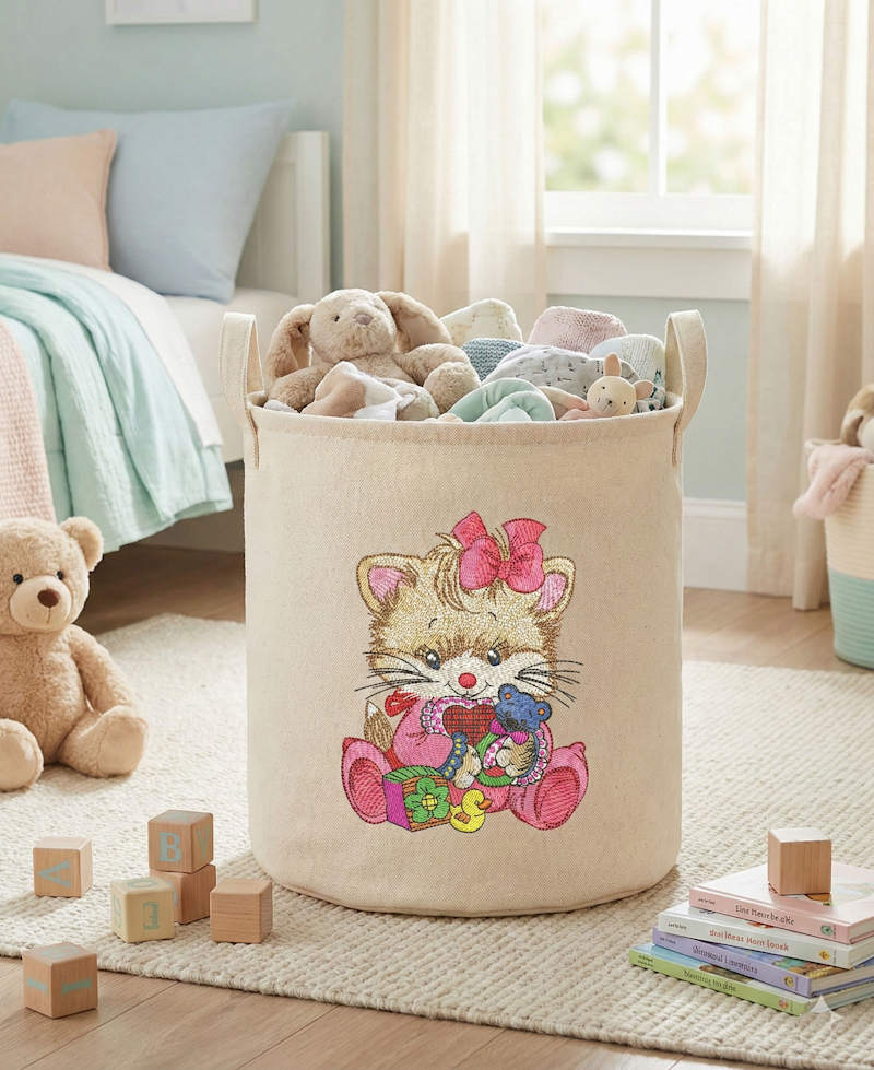 This kitten with baby rattle embroidery design features an adorable kitten holding a heart-shaped toy, decorated with soft pastel colors and fine stitched details. The gentle expression and playful elements make it perfect for baby-themed projects and cute decorative embroidery.