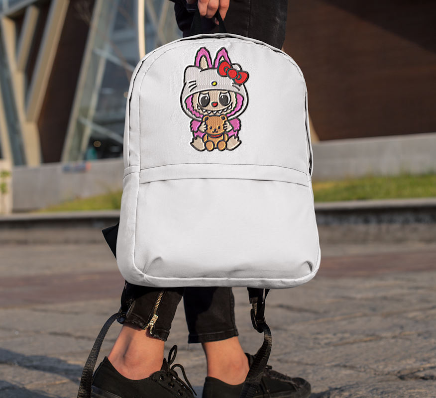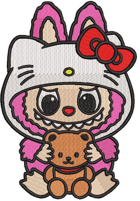 This adorable embroidery design features Labubu in a playful costume, holding a cute little teddy bear. With bold outlines and charming details, it's perfect for decorating kids' clothes, accessories, plush toys, or quirky gifts.