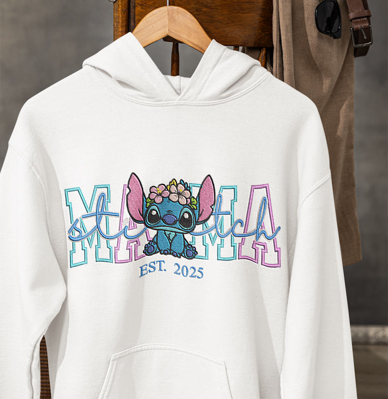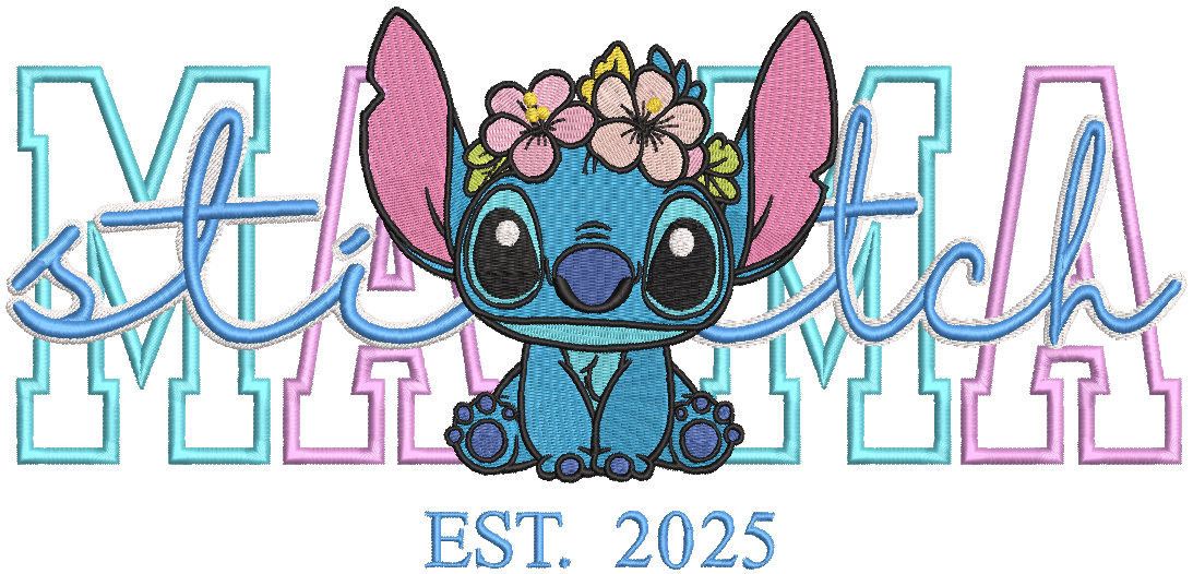 Celebrate mom with the Mama Stitch embroidery design, featuring Stitch in a sweet sitting pose. Perfect for Mother’s Day gifts, tote bags, pillows, and fan apparel, it adds love and Disney charm to every stitch.