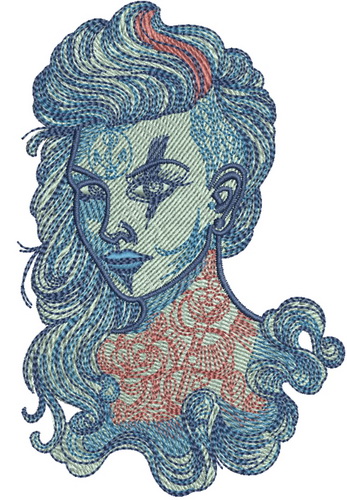 Check out this highly original machine embroidery design coming up next in our girls and women collection! This particular one features a marine witch. She has curly long hair and amazing makeup. Her skin is covered in beautiful tattoos the color of tuxedo red. Other color choices include Pacific blue, solar blue and cadet blue. This needlework is especially rich in detail which makes it such an artful decoration for your favorite things. Go ahead and stitch it out to sweaters, T-shirts, towels, pajamas, bathrobes, beach bags and accessories, makeup bags, cushions, blankets, quilts and more.
