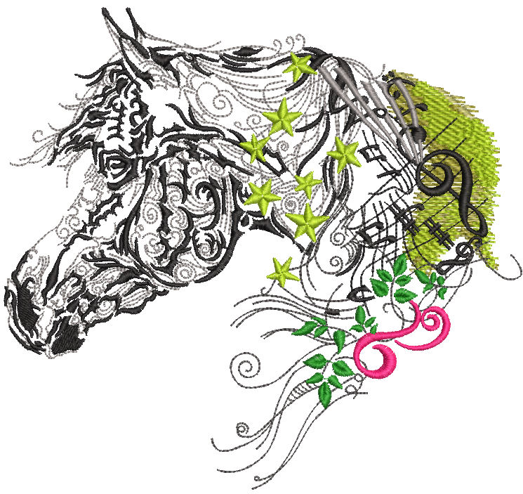 The Melody Horse Embroidery Design combines graceful equestrian beauty with musical artistry. Every stitch flows like a symphony — elegant black lines form the horse’s silhouette, while bright stars, vines, and treble clefs add a magical, rhythmic touch.