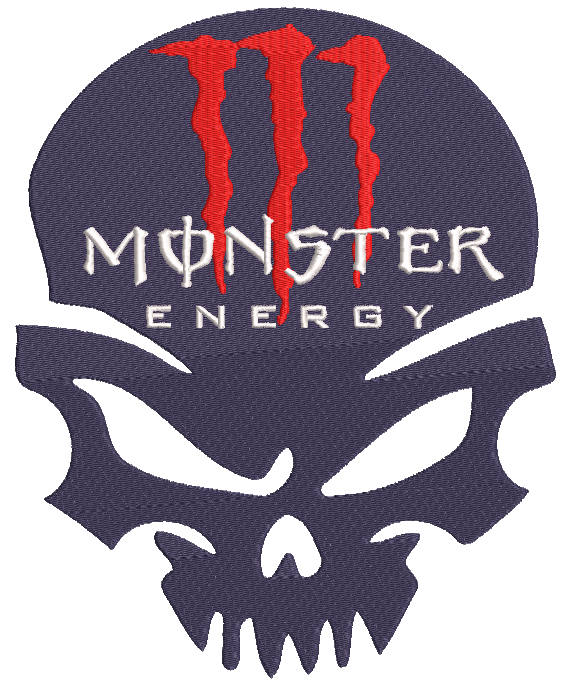 This Monster Energy Calavera Embroidery Design features a striking skull silhouette paired with sharp claw-mark strokes and edgy text styling. The vivid red scratch marks contrast powerfully with the dark calavera shape, creating a high-impact design perfect for jackets, hoodies, motorcycle gear, backpacks, caps, and bold streetwear projects.