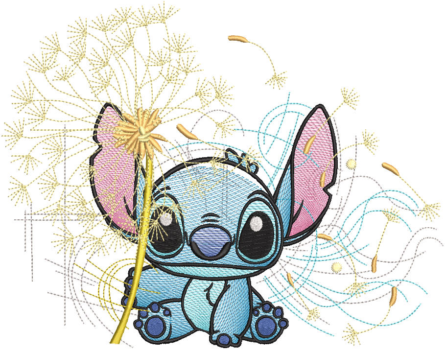 Add a gentle, whimsical touch with the Sitting Stitch with Dandelion embroidery design! Ideal for fans of Stitch, floral themes, and soft stitched decor, perfect on pillows, tees, and baby gifts.