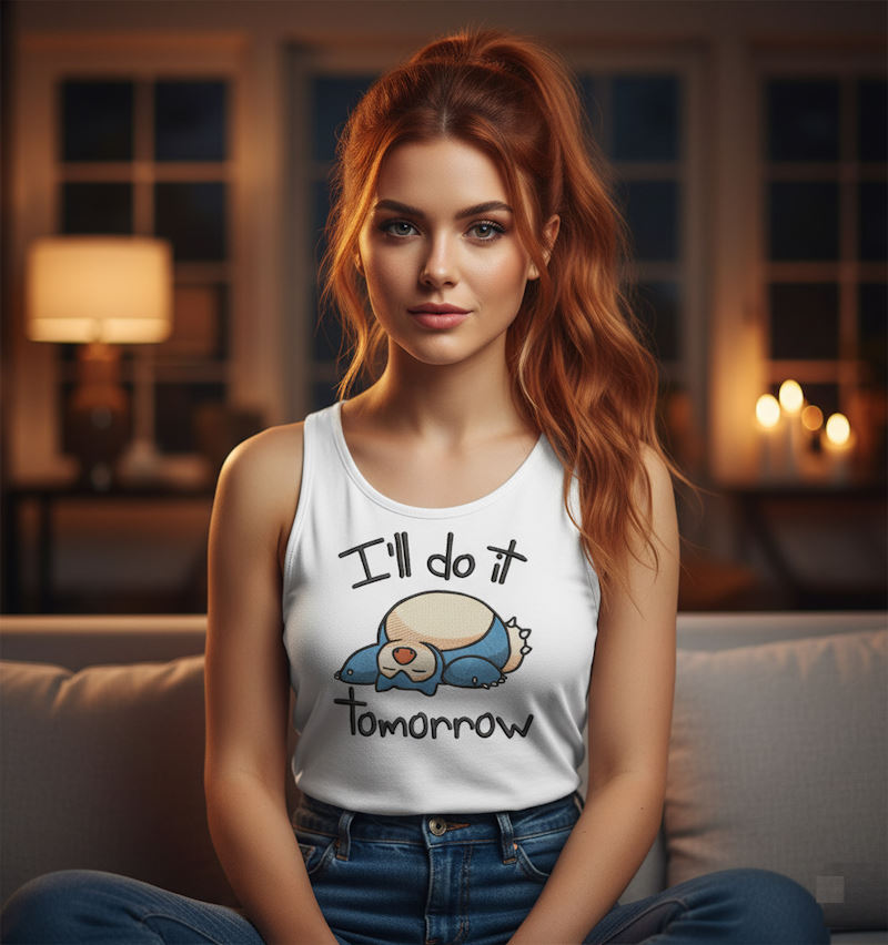 Featuring the classic blue-and-cream Snorlax stretched out under the playful phrase “I’ll do it tomorrow,” this design is perfect for adding humor and coziness to your projects.