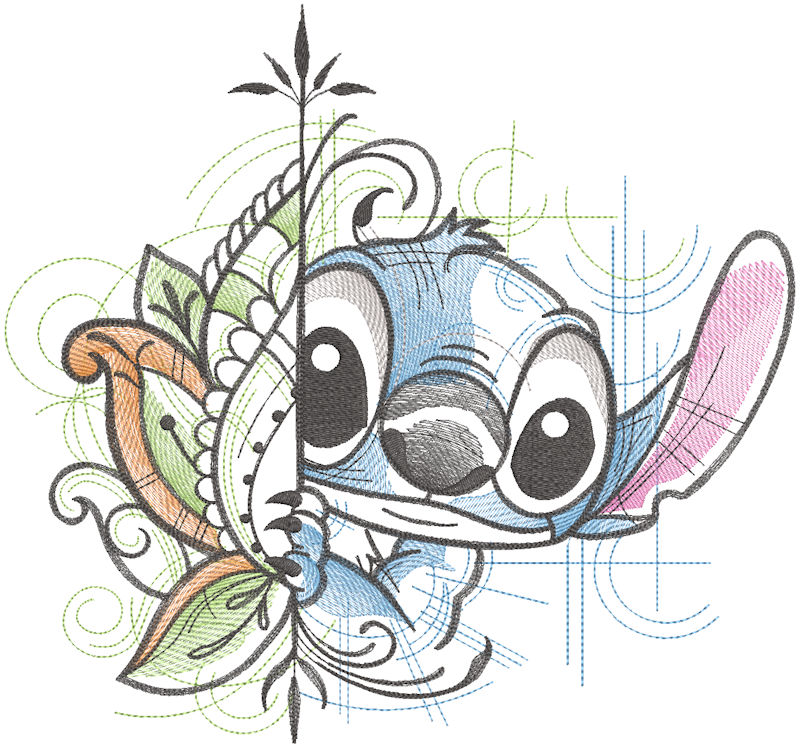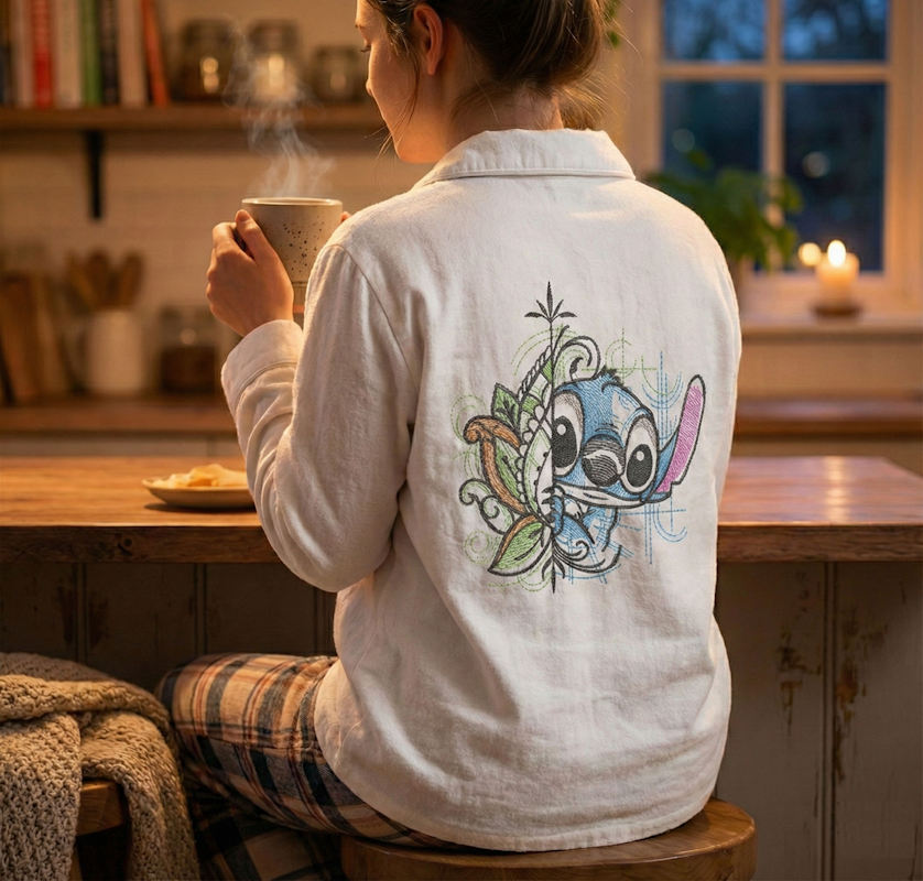 This Stitch Hawaii vibes embroidery design blends playful sketch lines with tropical leaves, swirls, and bright island colors. Perfect for summer totes, kids’ clothing, beach bags, and decorative hoops. Lightweight stitching gives clean results on cotton, linen, and light apparel.