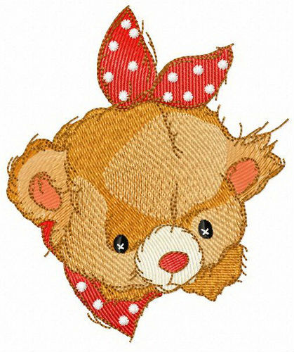 Looking for some original ideas with teddy bear machine embroidery designs? Check out this particular one which features a beige teddy bear in a red polka dot bib. The cute animal is also wearing a matching red bow on its head. The color palette is a cozy mix of gold, ivory, melon, saffron, chocolate and black. You can use this creative application to decorate a wealth of baby stuff such as onesies, bibs, bodysuits, T-shirts, pajamas, sweaters, hoodies, bed linen, blankets, cushions, quilts, toys, gift boxes, napkins, towels, duvet covers and much more. This design is compatible with most materials.